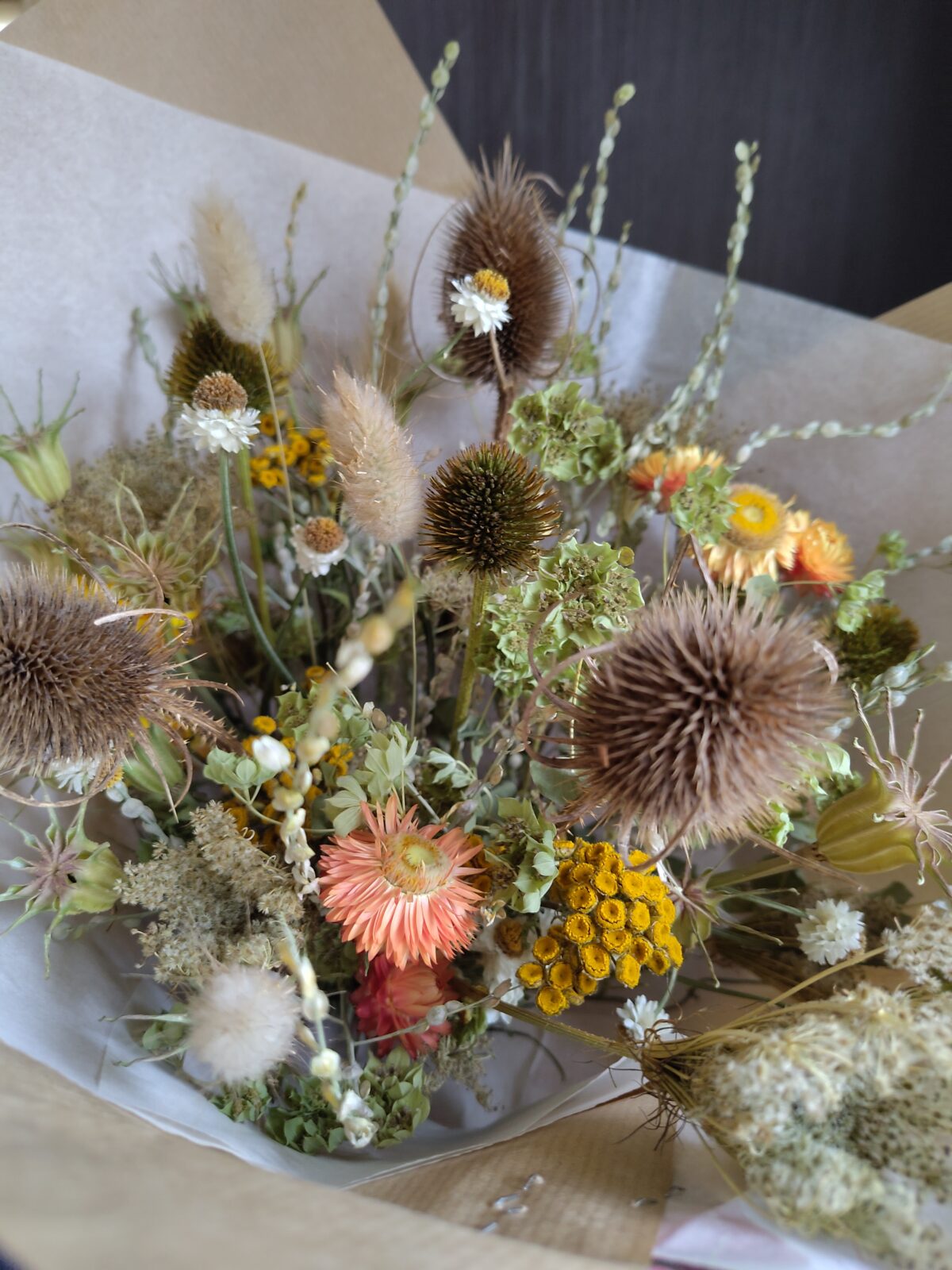 Droogboeket van eigen gekweekte, geoogste en gedroogde bloemen.