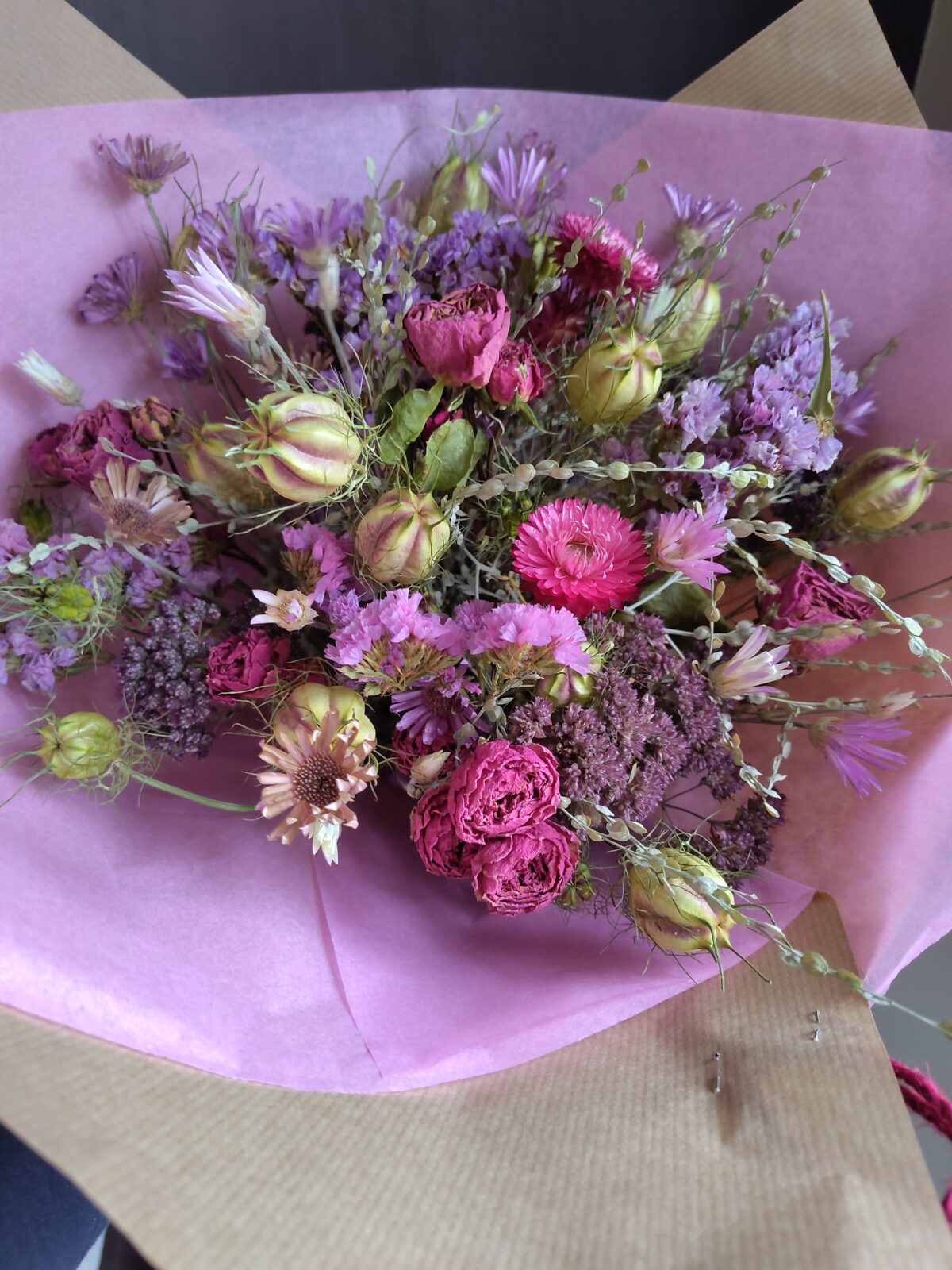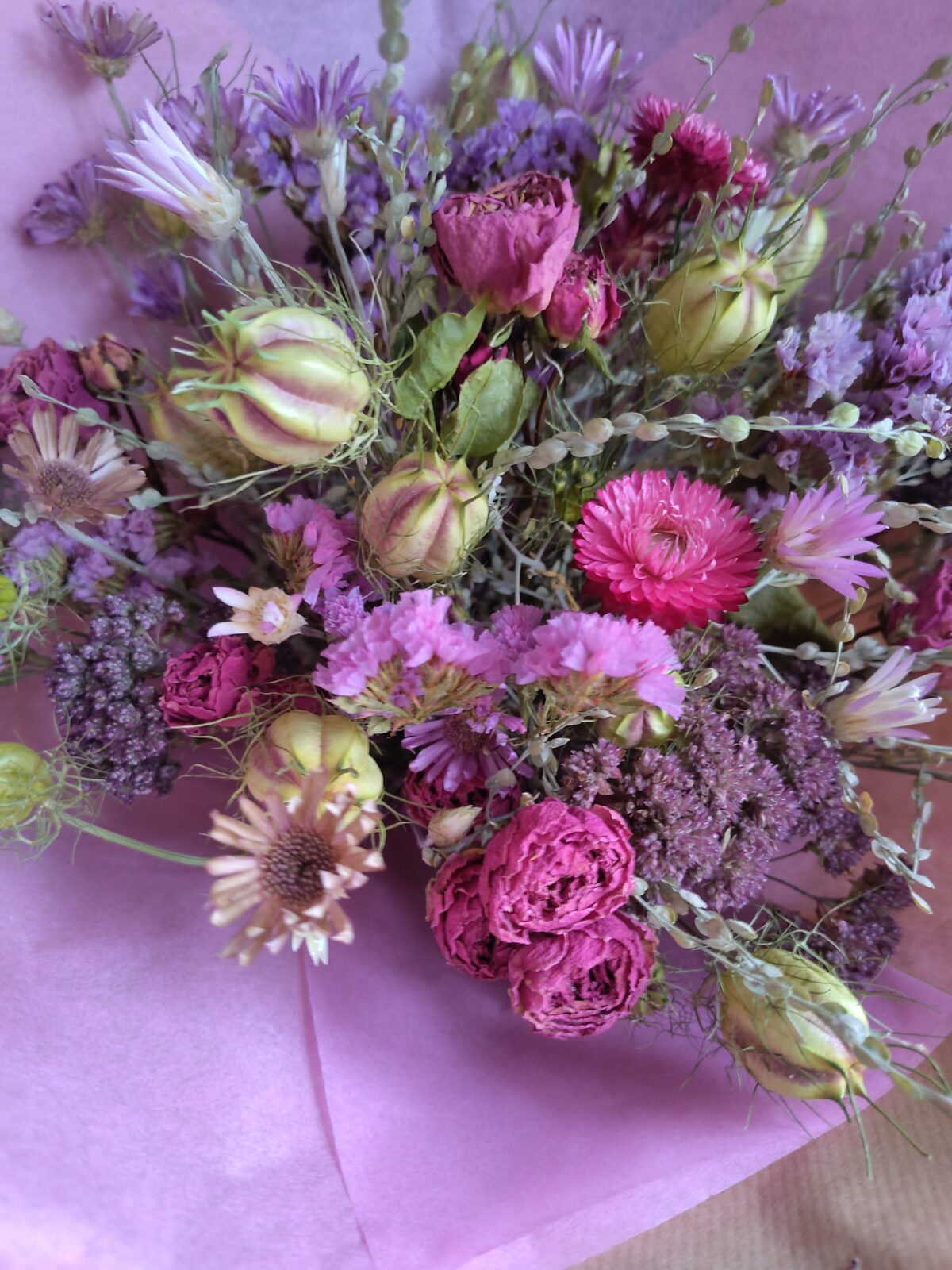 Droogboeket van eigen gekweekte, geoogste en gedroogde bloemen.